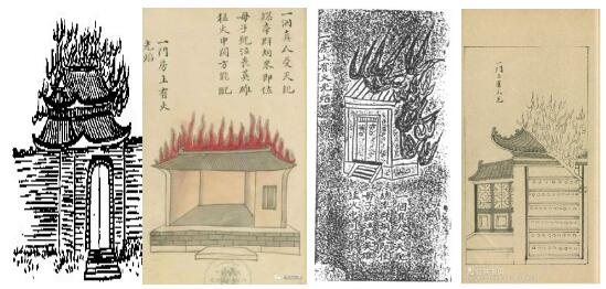 此图为赵匡胤带着众将,逼着柴宗训母子三人禅让退位,柴宗训有一个生母,一个养母,为姐妹,即大符太后和小符太后,此时已经没有英雄可以救他们,这在烈火中间,他们默默的退出了历史的舞台,在金圣叹版本中,更说出了二个母亲,大符太后在家,而小符太后最后出家为尼的结局,标志着一个动荡时代的结束。